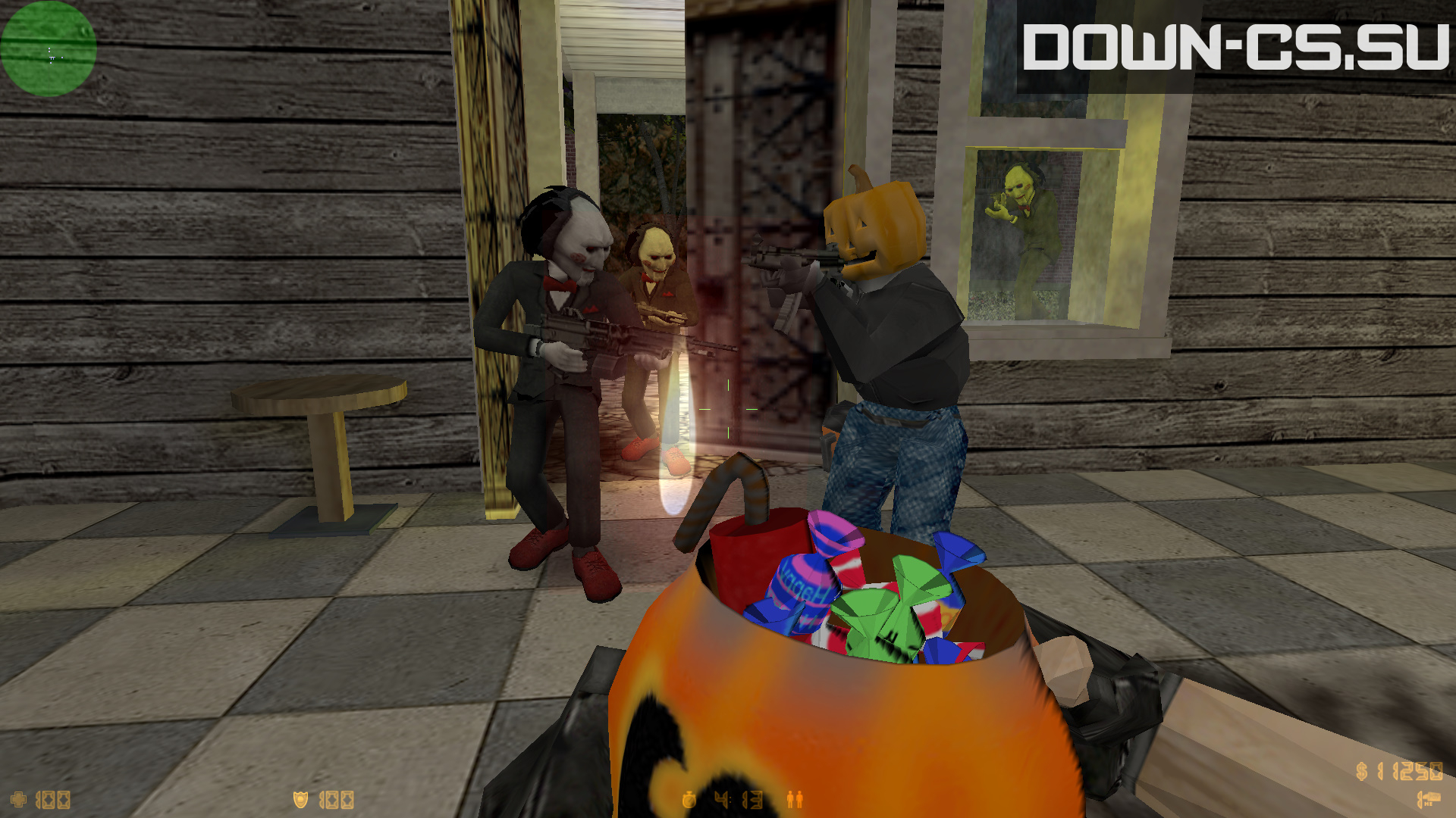 Now let's find out what CS Halloween has to offer. Right from the start we are introduced with a new spooky background, cool color scheme and interesting soundtrack. If it wasn't already obvious the game is fully designed in Halloween style and that looks really fascinating. After we enter a server we start noticing other new features: new player models that are presented in scary costumes. All terrorist have carved spooky pumpkins on their heads while CTs are dressed like an evil character from SAW movie.